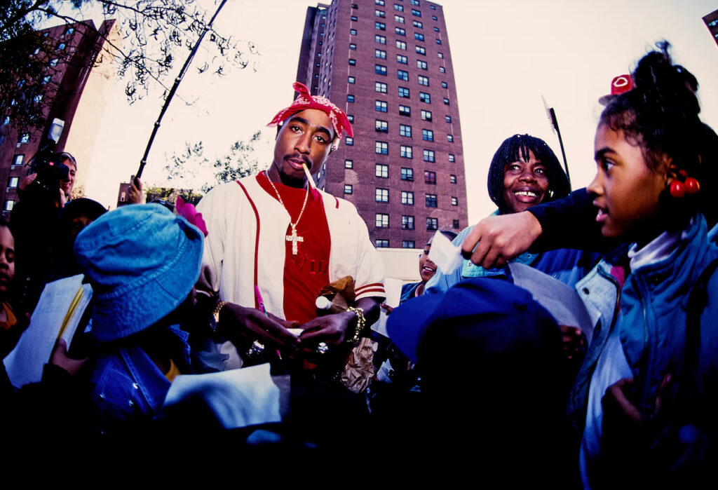 Když jsem ho fotil, zachycoval jsem ho v momentech mezi natáčením. Byl to prostě on, bavil se se svými kluky, ubalil si brko, naprosto prosté okamžiky ve srovnání s tím, když se objevily kamery a on šel před dav a dělal videorozhovor. Byly to dva naprosto odlišné momenty, kdy jsem 2Paca zachytil: jak si užívá pohodu, a pak, když vyšel před dav, mluvil s ním, rozdával autogramy a byl 2Pacem. Ale v jeho osobě nebyl žádný rozdíl.