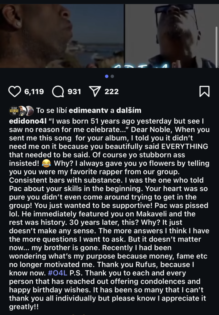 Reakce členů Outlawz a přátel Tupaca na sebevraždu Young Noblea – zdroj: instagram