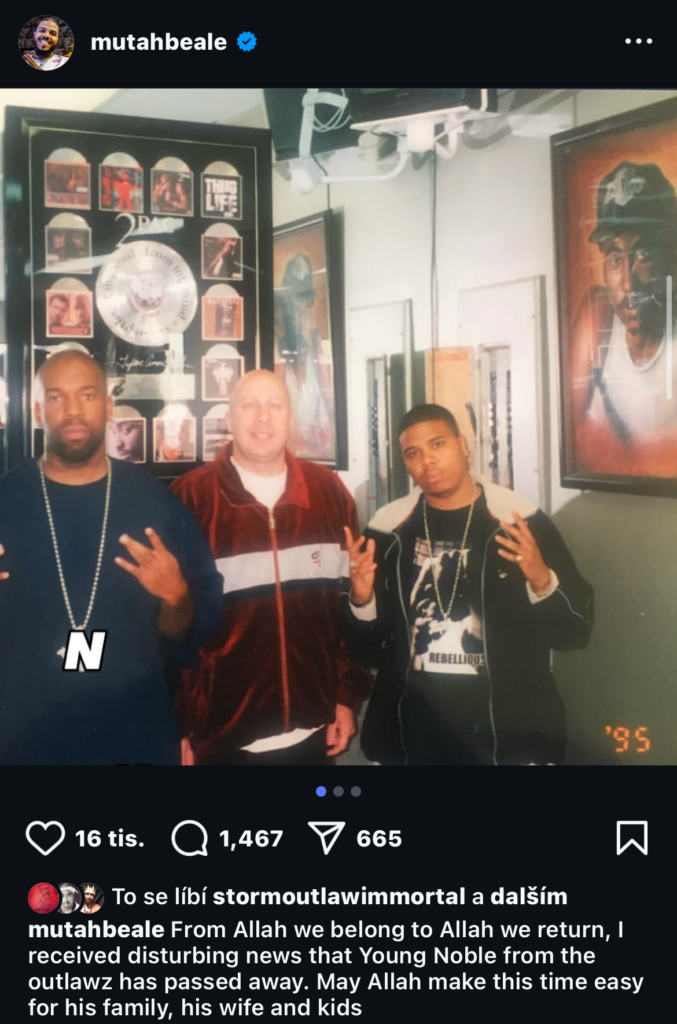překlad: Alláhovi patříme a k Němu se navracíme. Dostal jsem znepokojivou zprávu, že Young Noble z Outlawz zemřel. Kéž Alláh ulehčí tuto dobu jeho rodině, manželce a dětem.